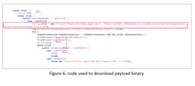 In the background, the malware repeatedly attempts to download a malicious binary from one of several hardcoded URLs. These URLs point to platforms such as GitHub, Cloudflare Pages, and a custom domain (uasecurity[.]org), all of which are used to host the miner payload. Figure 6 illustrates this behavior.