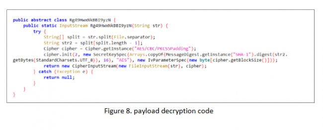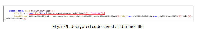 The malware first decrypts the downloaded binary using an AES algorithm (Figure 8). In the next step (Figure 9), the decrypted binary is written to a file named d-miner within the app’s private storage. Once written, the file is marked as executable.