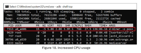 The top command output clearly shows the d-miner process running under the app’s user (u0_a606), consuming over 746% CPU and 27.5% memory. (See Figure 18) This confirms continuous cryptomining activity in the background, heavily impacting device performance.