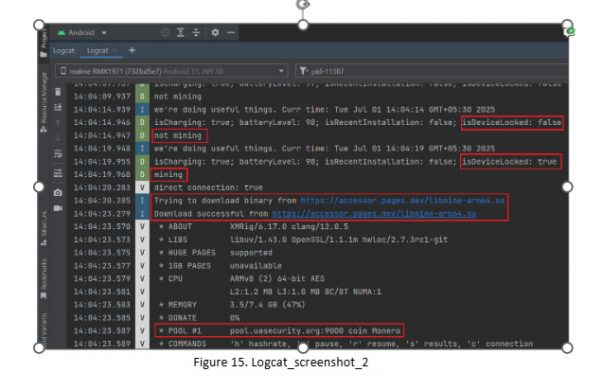 In the background, however, the malware begins monitoring the device’s status, particularly the battery level and screen lock state. Once the device is locked, the malicious app silently downloads an encrypted .so payload, decrypts it, and initiates cryptomining activity.