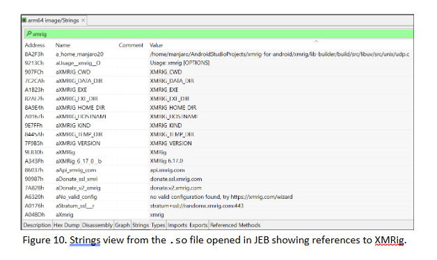 To retrieve the encrypted payload, a custom Java-based decryption method was used. Figure 10 confirms that the resulting .so file is based on or directly derived from XMRig’s Android build. The extracted strings reference internal configuration paths, usage instructions, version details, and mining-related URLs. These artifacts clearly validate that the primary purpose of this native library is CPU-based cryptomining.